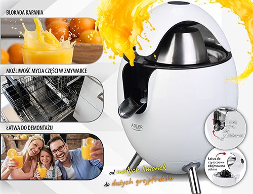 Miłośnicy świeżo wyciskanych soków oraz nowoczesnych technologii w kuchni z pewnością docenią wyciskarkę do cytrusów ADLER AD 4013. Jest to urządzenie, które nie tylko pozwala uzupełnić dietę w soki pełne witamin, ale również zdecydowanie ułatwi ich przygotowanie. Co więcej, sprzęt ten prezentuje się wyjątkowo elegancko i jego unikalny design sprawi, że możesz trzymać go na blacie jako dekorację.