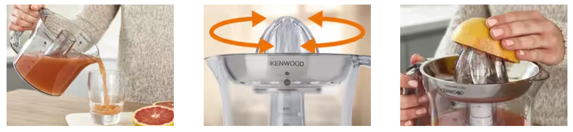 Niezwykle wydajna wyciskarka do cytrusów od Kenwood to moc 40 W z możliwością dwukierunkowego działania silnika. Urządzenie wyposażono w funkcjonalny, przezroczysty pojemnik o pojemności 1 l oraz praktyczny separator miąższu ze stali nierdzewnej. Model JE290 zyskał też specjalny schowek na kabel. Z wyciskarką cytrusów marki Kenwood szybko i sprawnie przygotujesz idealne soki z pomarańczy, mandarynek, cytryn, limetek i grapefruitów. A wszystko to bez udziału cukru, barwników i konserwantów. Od teraz poranne wyciskanie soku stanie się przyjemnym rytuałem.