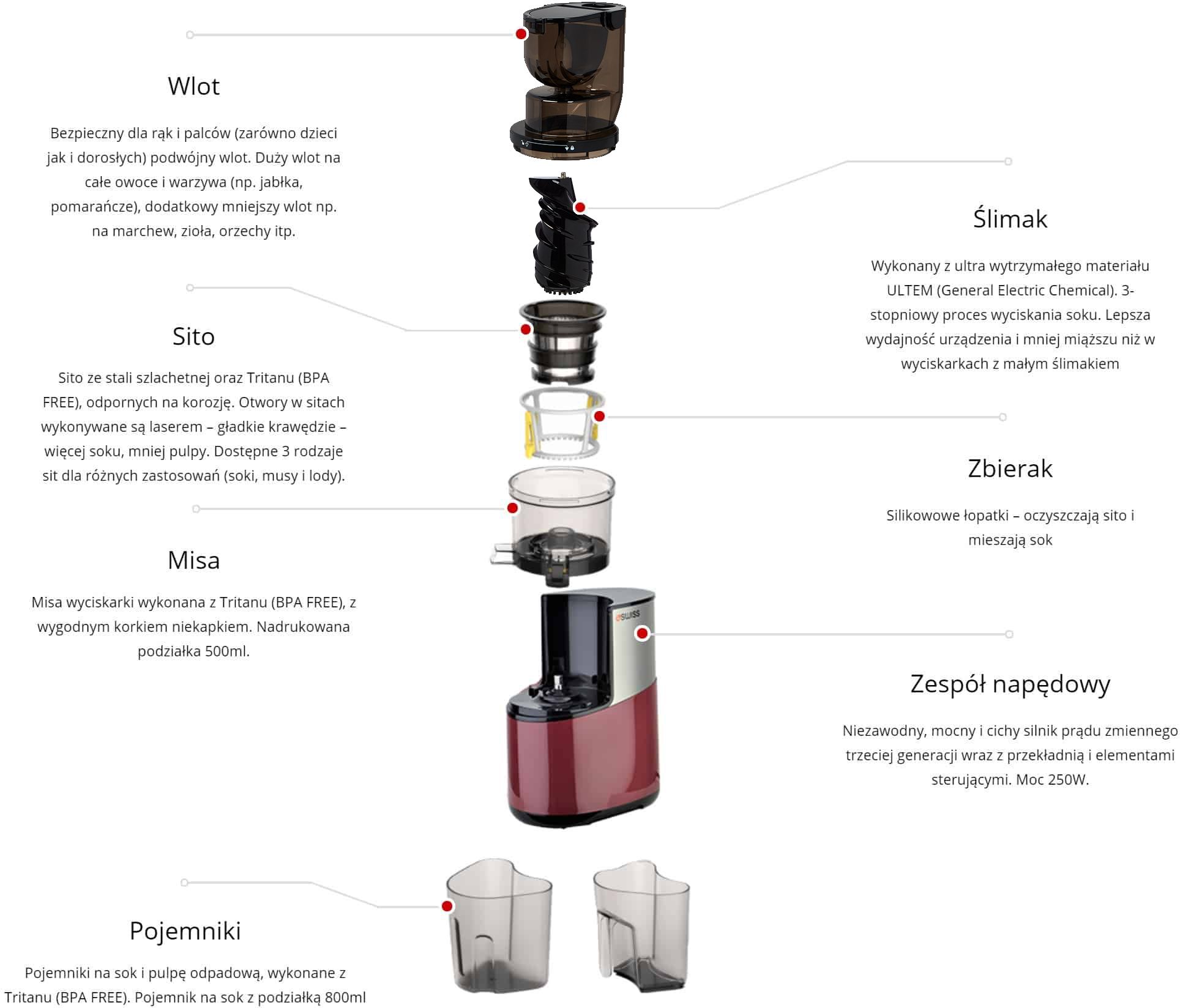 55obr/min. Zapewnia idealny balans pomiędzy szybkością uzyskania soku, a ochroną wartości odżywczych.