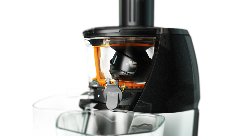 Urządzenie wyposażone zostało w funkcję auto-czyszczenia, która pozwala na przepłukanie sokowirówki między sokami bez konieczności demontażu. Obrotowy zbieracz obracając się w czasie wyciskania oczyszcza sokowirówkę i zwiększa jej wydajność. Zastosowany specjalny kształt elementu wyciskającego pozwala na uzyskanie maksymalnej ilości soku, zarówno z twardych jak i miękkich owoców i warzyw. Duży otwór wlotowy oraz wygodny popychacz ułatwiają wyciskanie soku. Ponadto, urządzenie wyposażone zostało w wykrojnik do jabłek, dzięki któremu w łatwy i szybki sposób podzielimy owoc na cząstki.