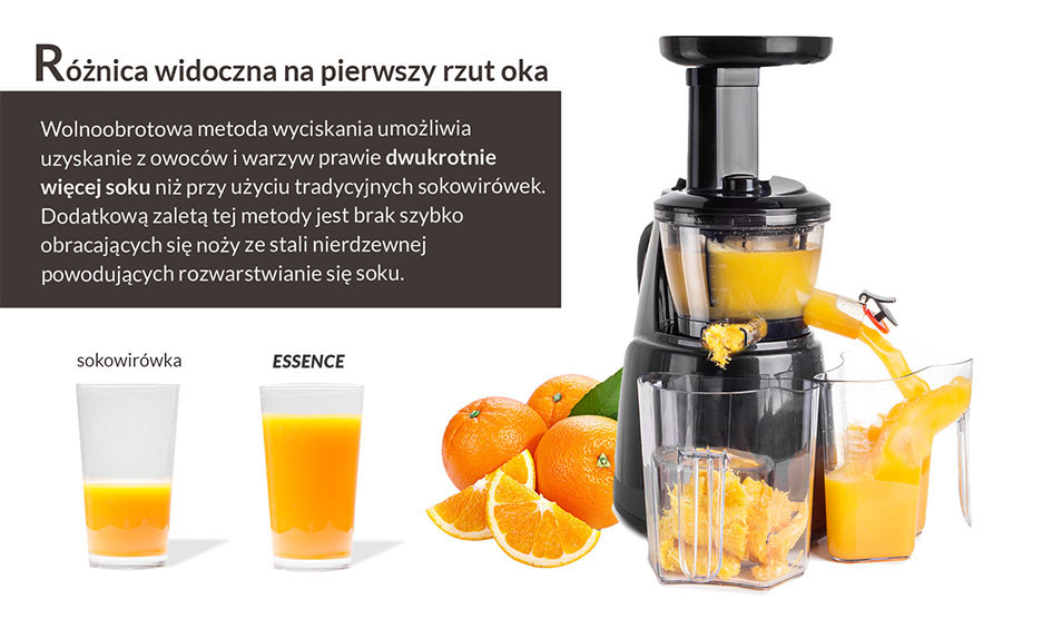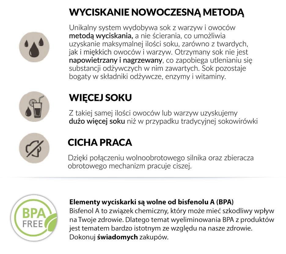to idealne rozwiązanie dla wszystkich miłośników zdrowych soków. Wysoka jakość urządzenia, w parze z dużą efektywnością i prostotą obsługi, pozwalają na przygotowanie soków z owoców, warzyw i ziół. W odróżnieniu od klasycznych sokowirówek, które ścierają i odwirowują produkt, wyciskarka ściska, a następnie przeciera przez sito wykorzystywane owoce czy warzywa. Dzięki temu przygotowany sok nie jest napowietrzany i nagrzewany, co zapobiega utlenianiu się substancji odżywczych, a przez to zawiera jeszcze więcej wartościowych składników odżywczych, enzymów, witamin i mikroelementów. Wolnoobrotowa metoda wyciskania umożliwia uzyskanie prawie dwukrotnie więcej soku niż przy użyciu tradycyjnych sokowirówek.