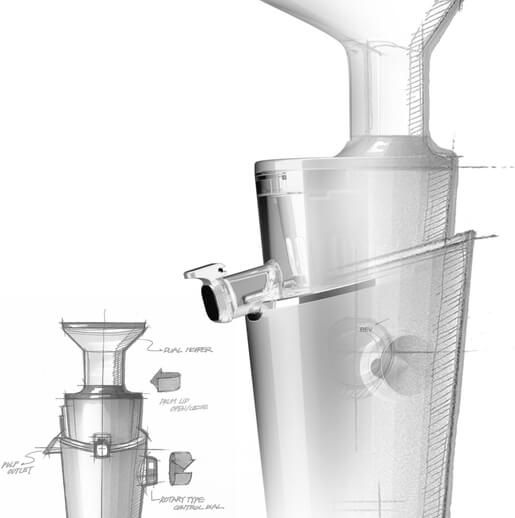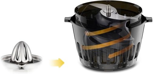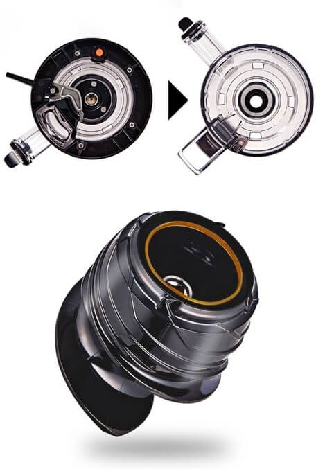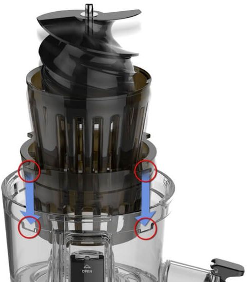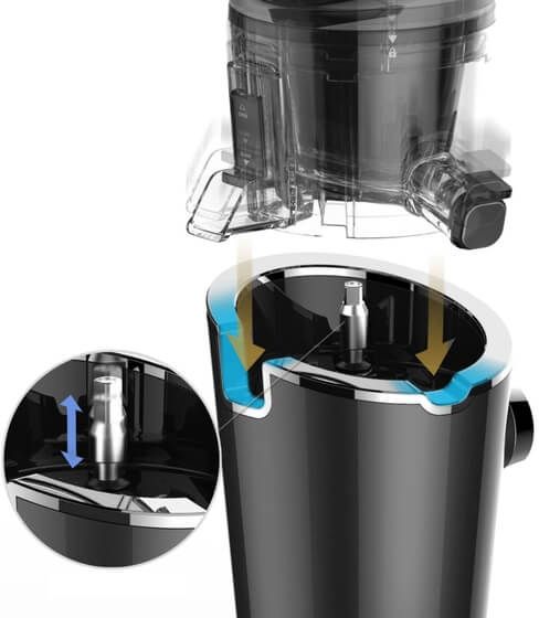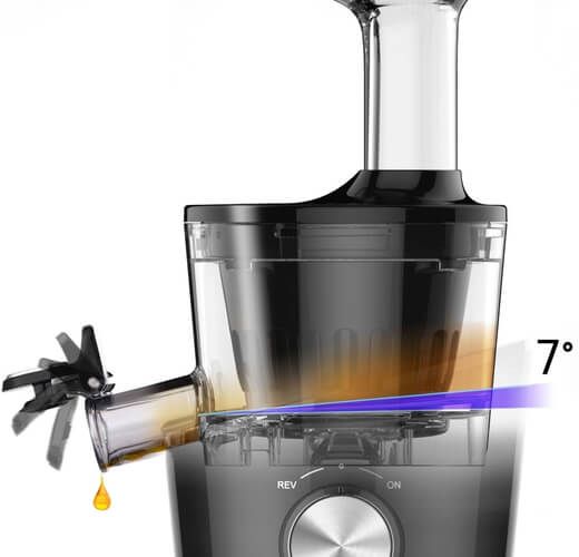Całkowite wydostawanie się soku, aż do ostatniej kropli dzięki 7-stopniowemu nachyleniu w dolnej części komory. Sok wydostaje się z komory bez konieczności przechylania wyciskarki.