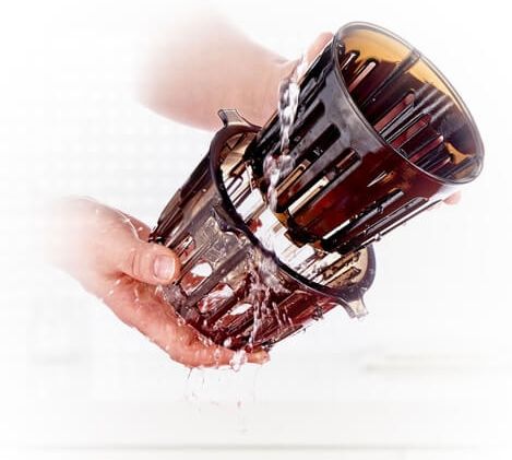 Filtr wewnętrzny i zewnętrzny zostały zaprojektowane tak, aby zapobiegać gromadzeniu się pulpy między szczelinami, przez co mycie urządzenia jest szybsze i łatwiejsze.