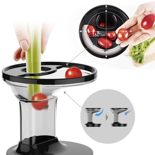 Otwór wsadowy ( największy jak do tej pory) pozwoli na wyciskanie większej ilości produktów. Natomiast prosty kąt i podwójny otwór sprawi że wyciskanie będzie łatwiejsze oraz wygodniejsze.