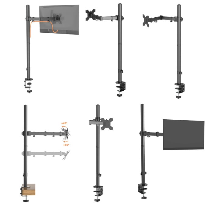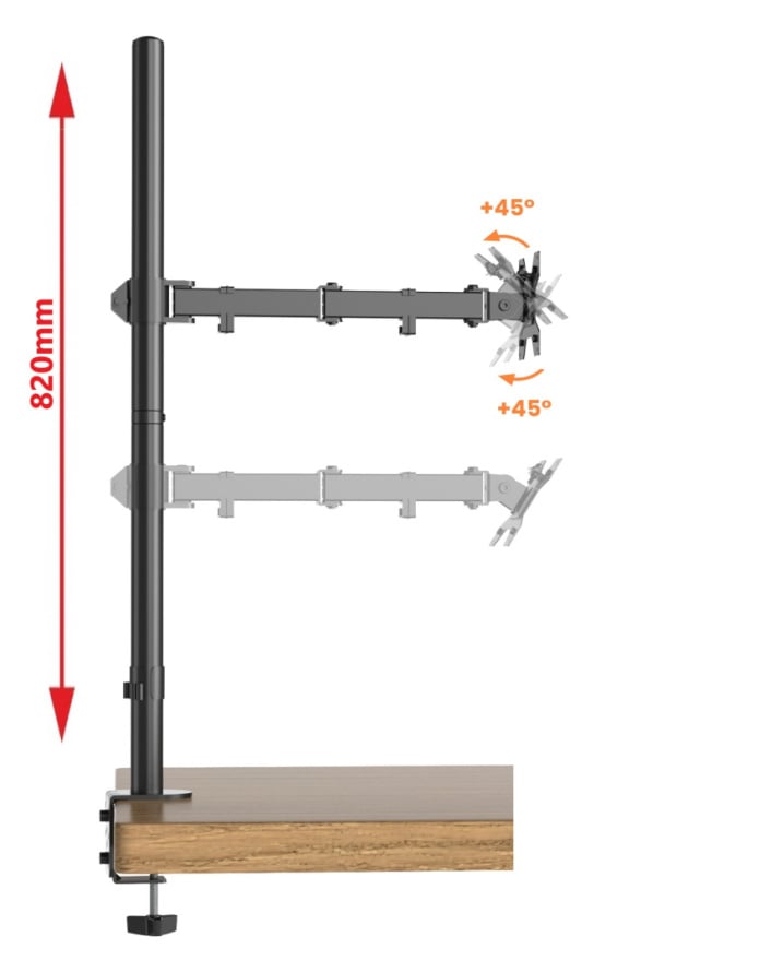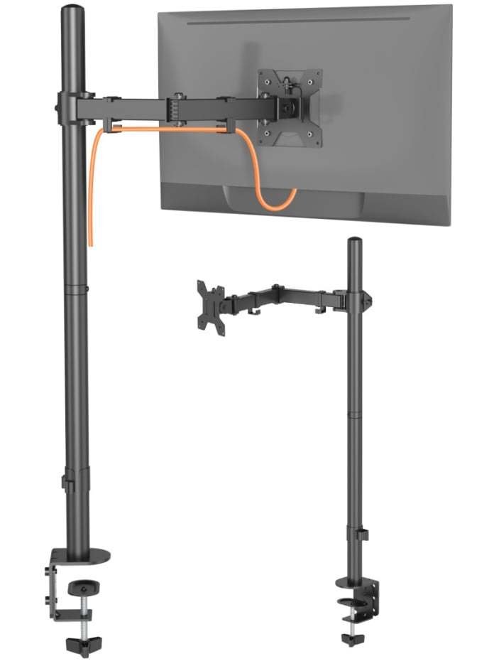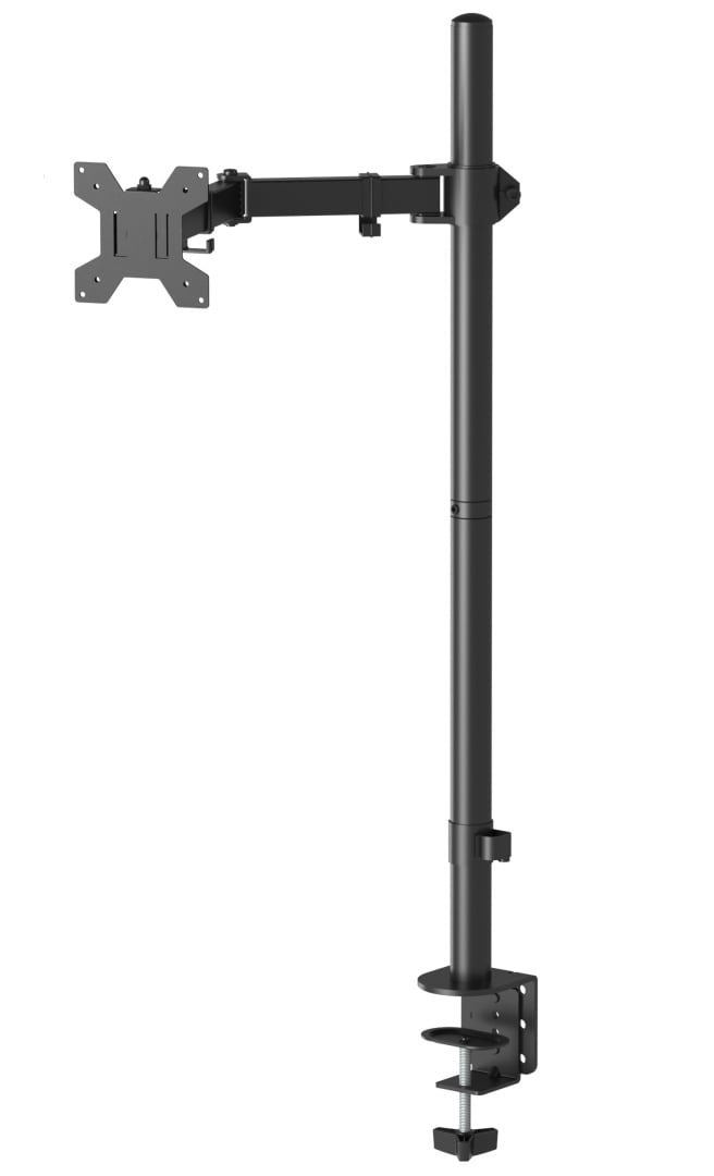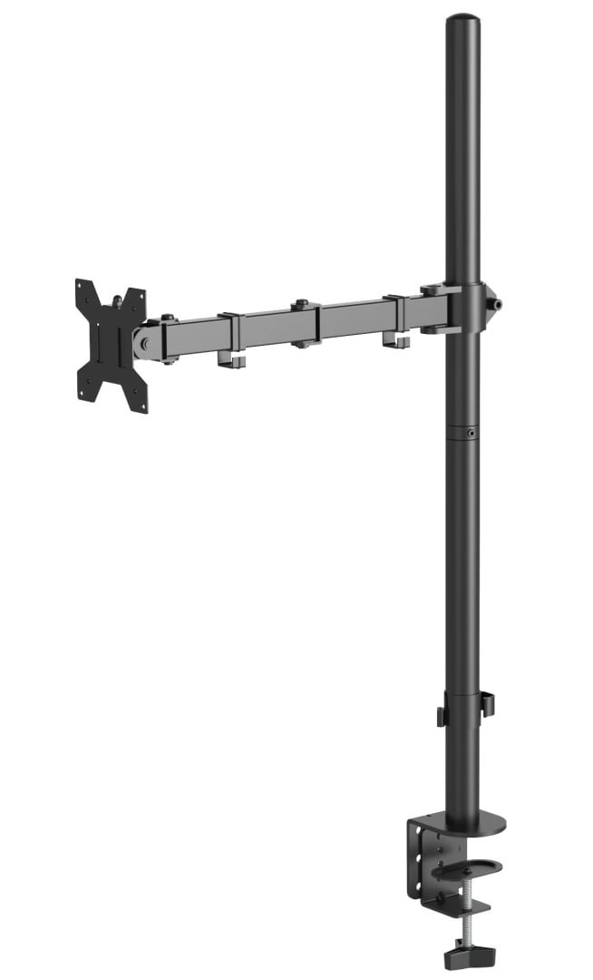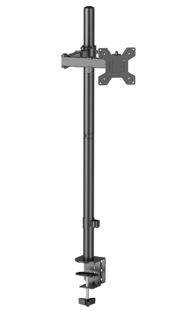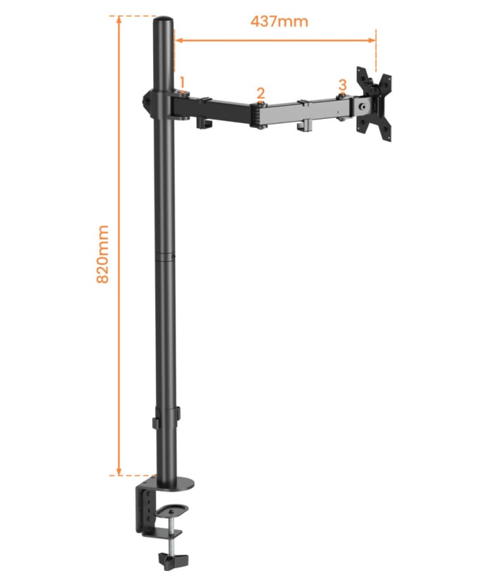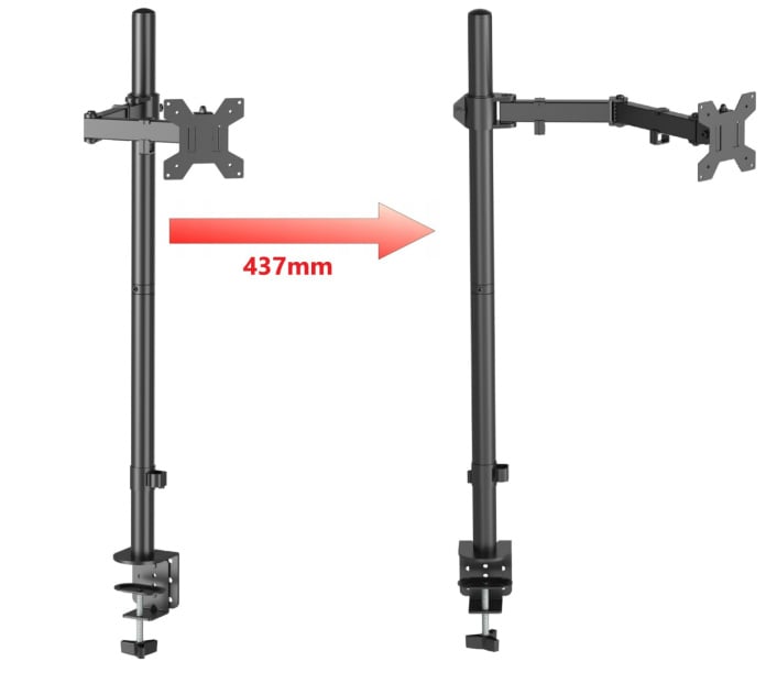 - Regulowane w 4 punktach ramię o długości 437mm (liczonej od środka pionowej rury do płyty mocującej monitor)
