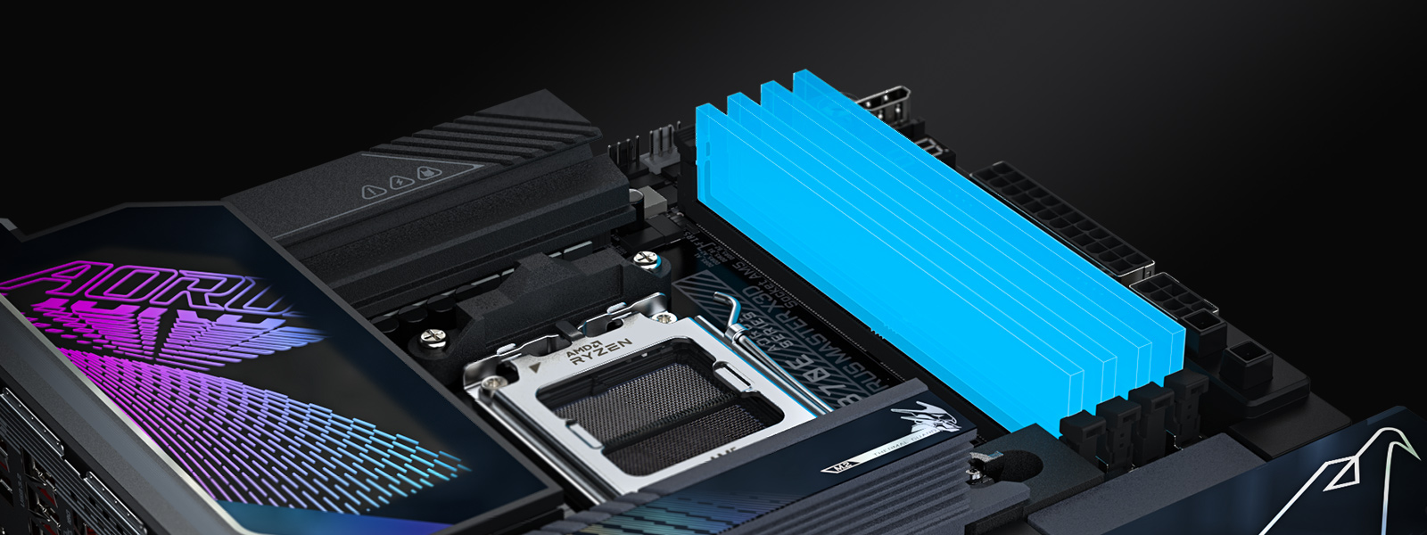 AORUS MASTER X3D w pełni wykorzystuje potencjał pamięci DDR5 dzięki czterem slotom DIMM z podwójnym kanałem, pozwalającym na instalację aż do 256 GB pamięci systemowej. Płyta obsługuje moduły pamięci z technologiami AMD EXPO™ i Intel XMP, a dzięki zaawansowanym rozwiązaniom sprzętowym i oprogramowaniu, umożliwia podkręcanie taktowania aż do imponujących 9000 MT/s. To kluczowa cecha dla graczy i twórców treści, którzy chcą zyskać przewagę dzięki maksymalnej przepustowości pamięci.