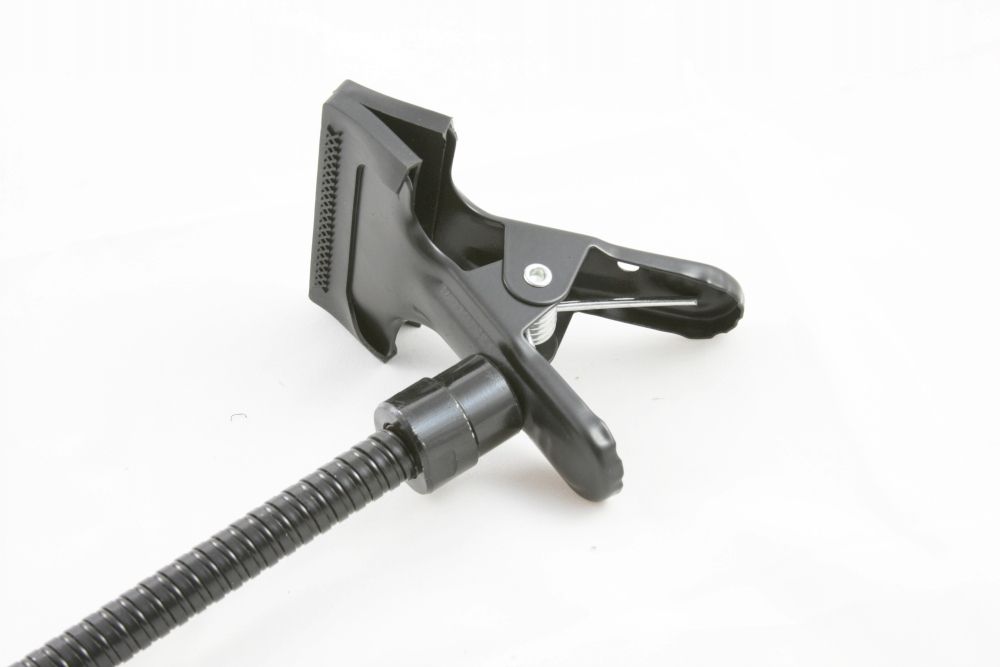 Klips / szczęki mocujące uchwytu wyłożono specjalną gumą amortyzującą, antypoślizgową. Dzięki temu mocując uchwyt nie musimy martwić się o zarysowania bądź uszkodzenia powierzchni do której mocujemy statyw.