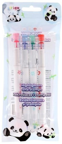 W zestawie 4 sztuki zakreślaczy ze stempelkami w kolorach: czerwony, różowy, niebieski i zielony.