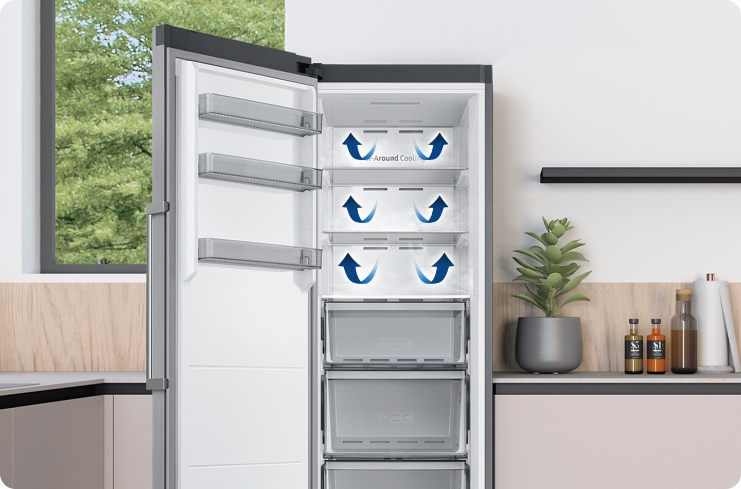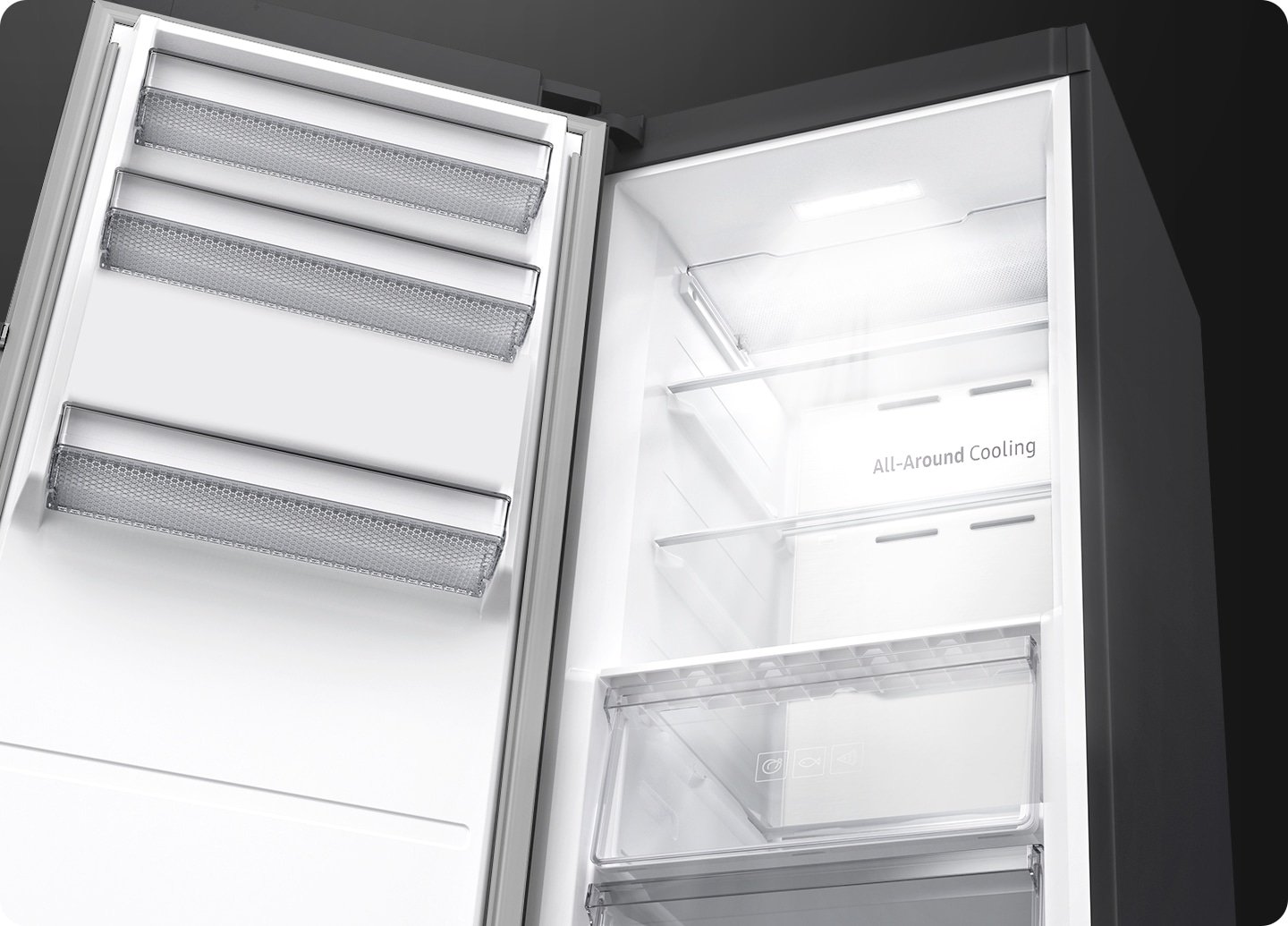 System All-Around Cooling równomiernie chłodzi każdą część zamrażarki. Zimne powietrze wdmuchiwane jest przez otwory wentylacyjne umieszczone na kilku poziomach, dzięki czemu temperatura wewnątrz jest stabilna, a jedzenie dłużej pozostaje świeże.