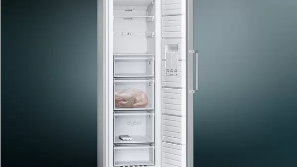 Cały udziec jagnięcy, kilka opakowań pizzy lub wysoki pojemnik pełen świeżo zebranych jagód - w przypadku szczególnie dużych lub nieporęcznych porcji żywności potrzebujesz przestrzeni w rozmiarze XL. Rozwiązanie bigBox zapewnia sporo miejsca, by wszystko poustawiać i pomieścić. A gdy potrzebujesz jeszcze większej przestrzeni, z zamrażalnika można łatwo wyjąć wszystkie szuflady i półki, co szybko oddaje całą jego pojemność do Twojej dyspozycji.