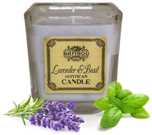 Zapachowa świeca sojowa – Lawenda i Bazylia. Wymiary 7 x 7 x 8 cm. Doskonała seria świec zapachowych umieszczonych w dużych, szklanych pojemnikach z recyklingu. Wykonana z uwodornionego oleju sojowego i pięknych aromatów stworzonych z mieszanki naturalnych olejków eterycznych i wysokiej jakości olejków perfumeryjnych. Świece z wosku sojowego są doskonałą, ekologiczną alternatywą dla świec parafinowych. Nie posiadają w składzie syntetycznego wosku lub parafiny. Dzięki równomiernemu spalaniu, wosk nie pozostaje na ściance słoiczka.