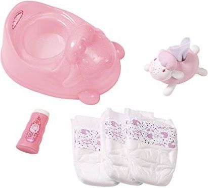 Śliczny i wyjątkowy zestaw z nocnikiem dla lalki, kompletem pieluszek, zasypką oraz uroczą owieczką, która służy jako pojemnik na chusteczki higieniczne.