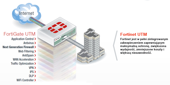 Fortigate FG-80C to zintegrowany system bezpieczeństwa dostarczający funkcjonalności: firewall, VPN, antywirus, IPS (ochrona przed atakami), filtrowanie treści WWW, ochrona przed spamem, DLP (ochrona przed wyciekiem informacji poufnej), kontrola aplikacji , optymalizacja pasma, kontroler sieci bezprzewodowych, mocne uwierzytelnianie.