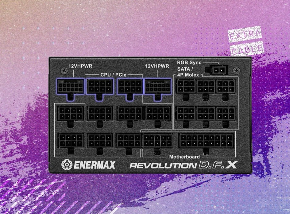 REWOLUCJA D.F. X pomaga przygotować się na przyszłość dzięki kolejnemu kablowi adapterowemu 600 mm z podwójnymi 8-pinowymi złączami PCIe po stronie zasilacza i złączem 12VHPWR po stronie karty graficznej, co pozwala na elastyczne budowanie.