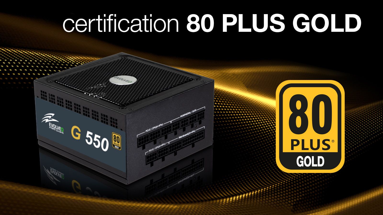 Zasilacz do gier EVOLVEO G550 ma certyfikat 80 PLUS GOLD. Certyfikat ten gwarantuje wysoką sprawność przy różnych rodzajach obciążenia. Gdy obciążenie zasilacza wynosi około połowy, gwarantowana sprawność wynosi 90%. Przy dużych lub niskich obciążeniach wydajność zasilacza spada. Z tego powodu sprawność wynosi 87% przy obciążeniu 20% lub 100%. Istnieją również zabezpieczenia przed uszkodzeniem zasilacza lub komponentów w komputerze. Istotnymi cechami są zabezpieczenia zwarciowe, przeciążeniowe, przepięciowe, podnapięciowe i termiczne.