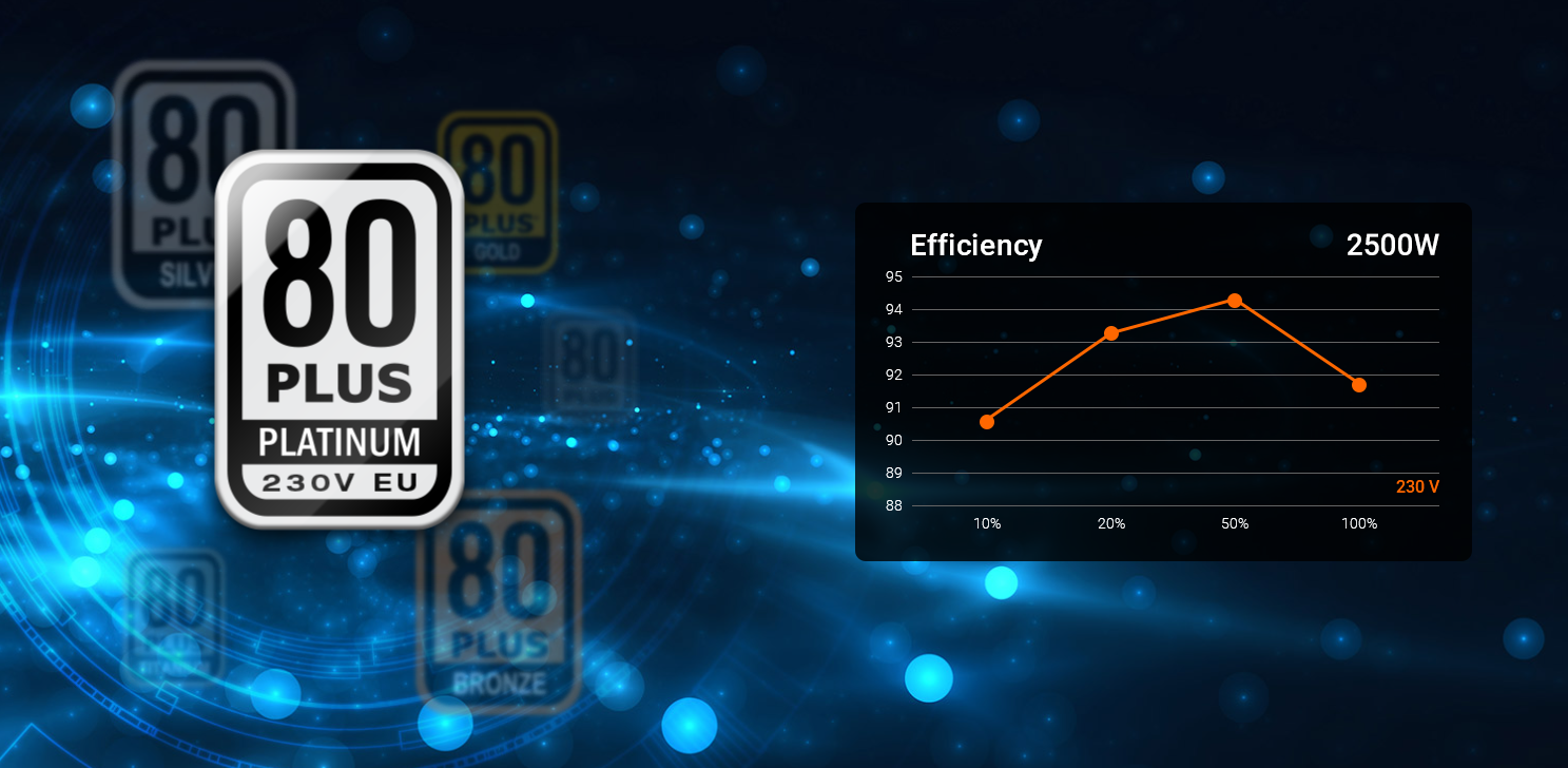 Certyfikat 80 PLUS® 230V EU Platinum potwierdza niezwykłą efektywność FSP Cannon Pro 2500W. Zasilacz charakteryzuje się minimalnymi stratami mocy, co przekłada się na mniejsze wydzielanie ciepła i cichszą pracę wentylatora. Wysoka konwersja energii, sięgająca nawet 94%, oznacza również mniejsze rachunki za prąd. To idealne rozwiązanie dla tych, którzy cenią sobie wydajność i oszczędność.