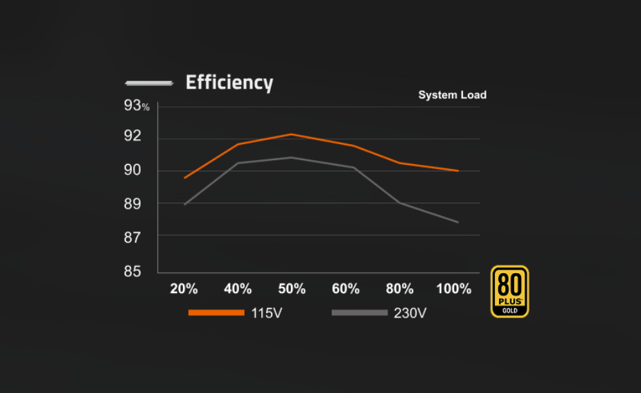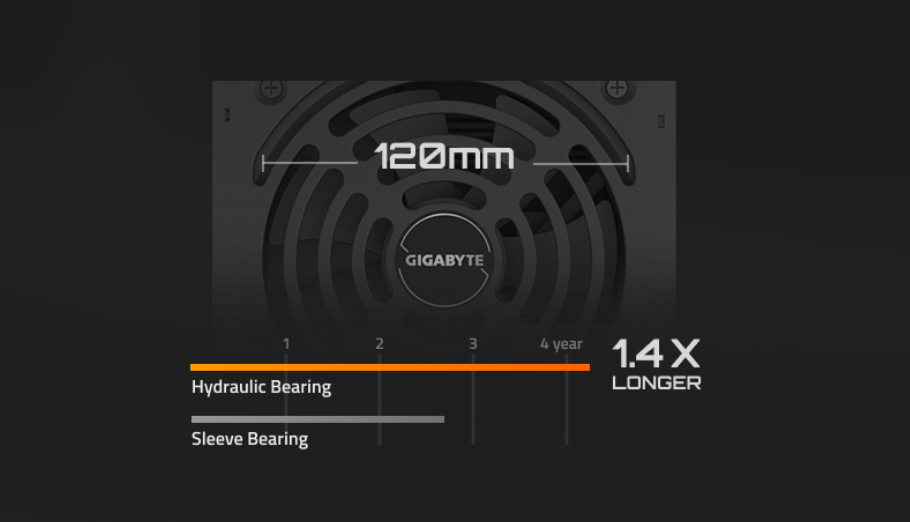 Zasilacz GIGABYTE P650G jest wyposażony w 120-milimetrowy wentylator z łożyskiem hydraulicznym (HYB), który dba o optymalną temperaturę pracy. Wentylator jest sterowany w inteligentny sposób, dostosowując swoją prędkość obrotową do bieżącego obciążenia, co minimalizuje generowany hałas. Nawet pod dużym obciążeniem zasilacz pozostaje cichy, dzięki czemu nie zakłóca komfortu pracy ani rozrywki. To idealne rozwiązanie dla osób ceniących sobie ciszę w komputerze.
