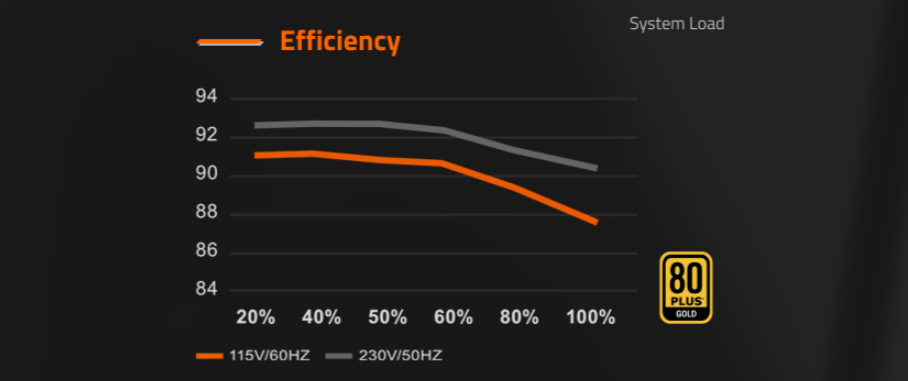 Wysoką sprawność energetyczną zasilacza potwierdza certyfikat 80 PLUS Gold. Oznacza to, że co najmniej 90% dostarczanej energii jest przekazywane do komponentów, a jedynie niewielka część jest tracona w postaci ciepła. Dzięki temu zasilacz pracuje z niższymi temperaturami, co przekłada się na dłuższą żywotność podzespołów. Wyższa sprawność to także mniejsze zużycie energii elektrycznej, co ostatecznie obniża rachunki za prąd.