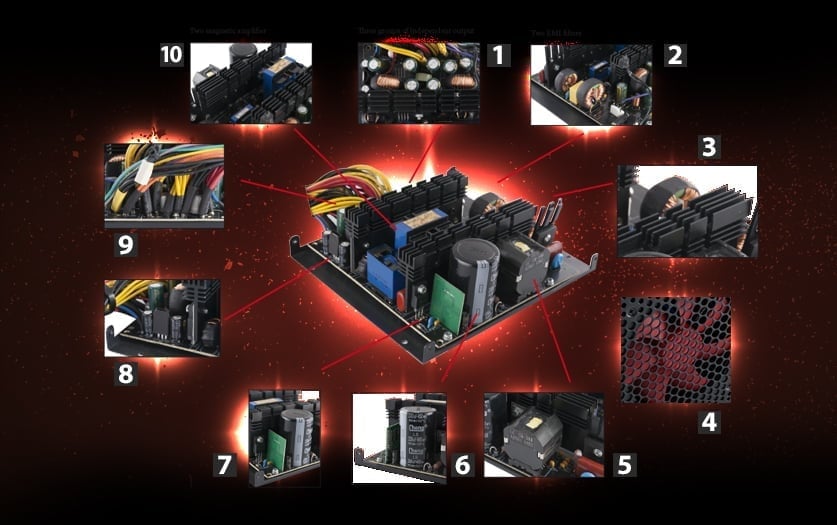 Server PCB - zastosowana płytka PCB typu serwerowego jest aż o 11% większa niż w standardowym zasilaczu. Zawiera ona także dwa razy więcej miedzi - 2 uncje (56,7 g), dzięki czemu osiągnęliśmy efekt dobrego rozpraszania ciepła. To z kolei pozwala zmniejszyć straty i poprawić sprawność przewodzenia, zwiększyć oszczędności energii w stosunku do zasilaczy z pasywnym PFC oraz innych zasilaczy z aktywnym PFC