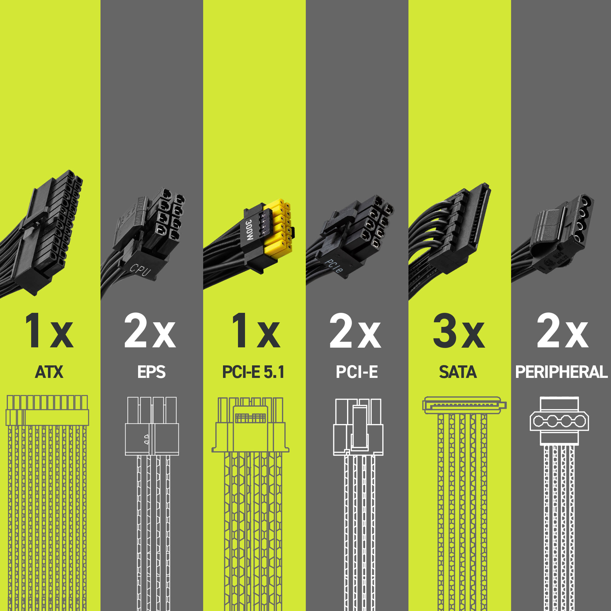 Poprzez natywne złącze 12V-2x6 zasilacz może dostarczyć do karty graficznej zgodnej ze standardem PCIe 5.1 do 300 W mocy. Kabel wyposażony jest we wtyczkę w kolorze żółtym, która pomaga w zidentyfikowaniu luźnych połączeń.