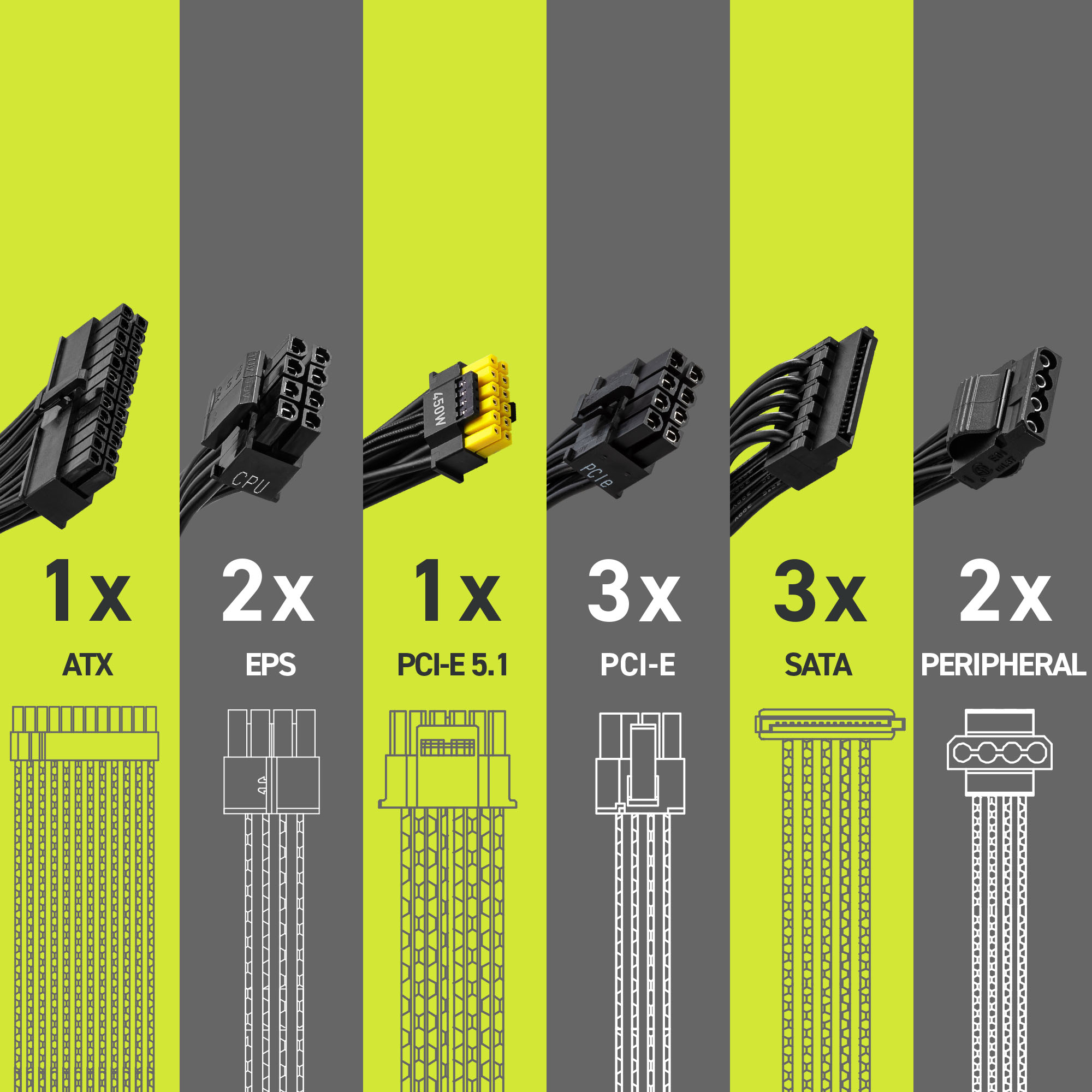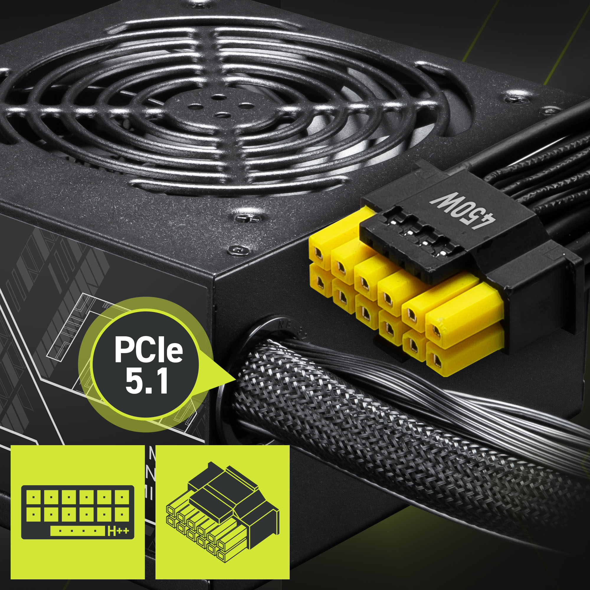 Poprzez natywne złącze 12V-2x6 zasilacz może dostarczyć do karty graficznej zgodnej ze standardem PCIe 5.1 do 450 W mocy. Kabel wyposażony jest we wtyczkę w kolorze żółtym, która pomaga w zidentyfikowaniu luźnych połączeń.