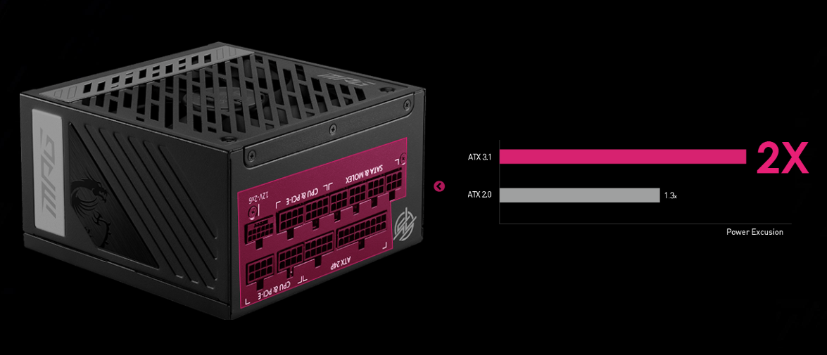 Zasilacz wyposażony jest w port wyjściowy zgodny ze standardami PCIe 5.1 i Intel PSDG (Power Supply Design Guide) ATX 3.1. Dodatkowo urządzenie charakteryzuje się odpornością na gwałtowny skok zużycia mocy do dwukrotności wartości całkowitego jej poboru, a także jest w stanie wytrzymać gwałtowny skok zużycia mocy do trzykrotności wartości mocy pobieranej przez GPU.