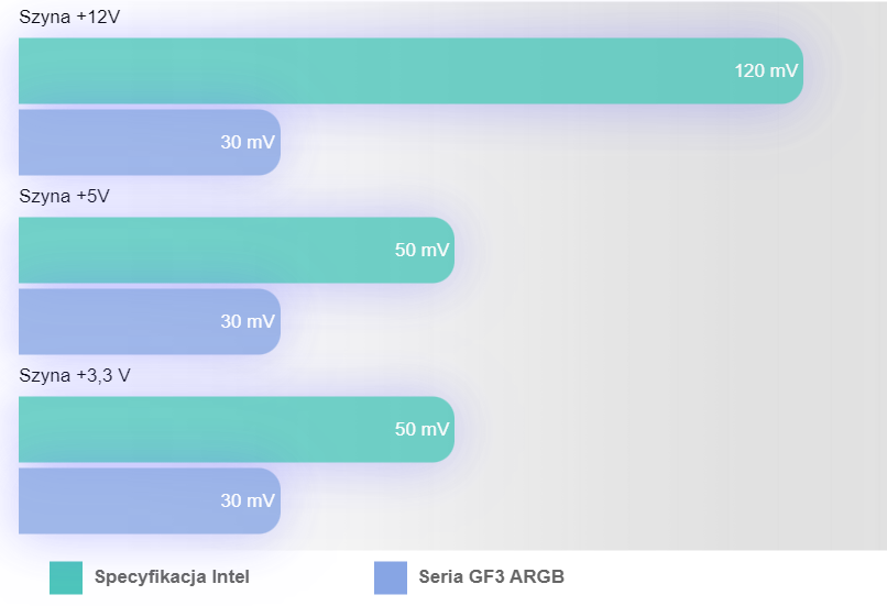 Seria Toughpower GF3 ARGB jest w pełni kompatybilna ze specyfikacją Intel ATX 3.0, która obsługuje skok mocy do 200%, osiąga 70% wydajność przy niskim obciążeniu i jest zgodna z wymaganymi standardami casu reakcji zasilania.