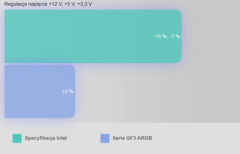Regulacja napięć jest bardziej rygorystyczna niż standard Intela +5%, -7% dla głównych szyn i ±10% dla -12V, jest ustawiona na nie więcej niż ±2% dla głównych szyn, zapewniając stałe, czyste zasilanie dzięki wyjątkowej stabilności napięć.