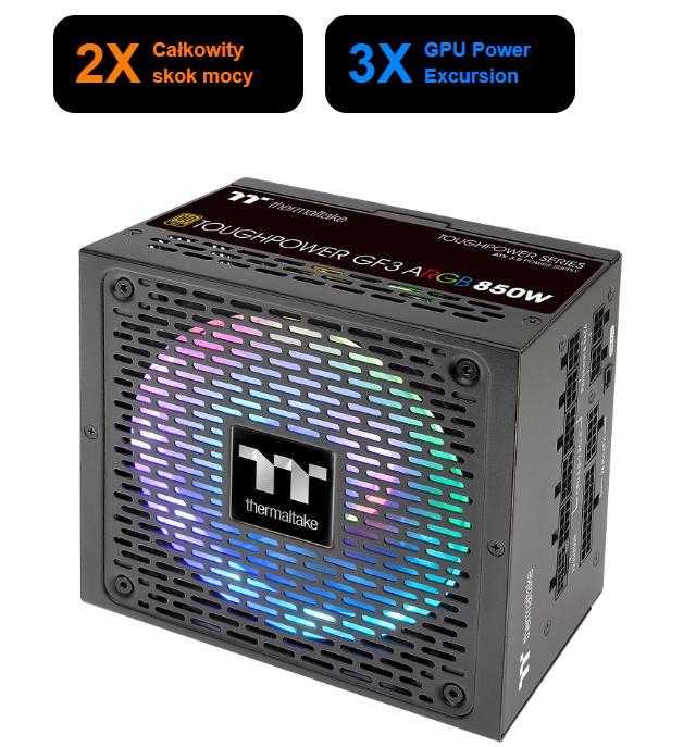 Seria Toughpower GF3 ARGB Gold (750W/850W) została zaprojektowana tak, aby spełniać standardy ATX 3.0, wyposażona w złącze PCIe Gen 5.0 12VHPWR. Nowy zasilacz ATX 3.0 jest gotowy do zasilania kart graficznych i procesorów nowej generacji. Adresowalny wentylator RGB o iluminacji 16,8 milionów kolorów i średnicy 140 mm z fabrycznie zainstalowanymi 18 diodami LED zapewnia jaśniejsze i bogatsze oświetlenie oraz obsługuje synchronizację z popularnymi płytami głównymi.