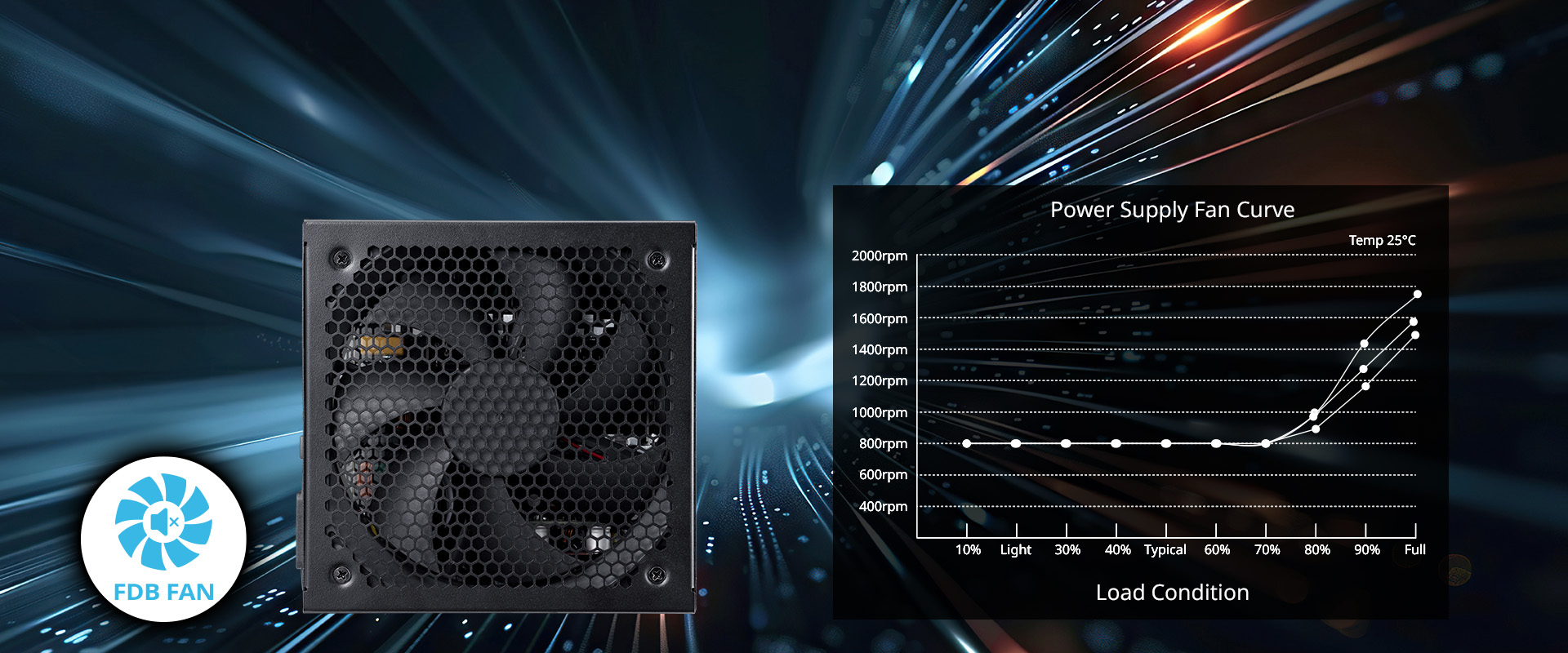 Zasilacz PYLON II jest wyposażony w wentylator FDB, zapewniający cichą pracę i długotrwałą wytrzymałość. Utrzymuje niską temperaturę systemu nawet przy dużych obciążeniach, zapewniając optymalne chłodzenie bez podnoszenia poziomu hałasu.