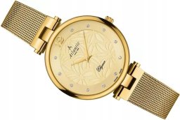Okrągła koperta o średnicy 32 mm i wysokości 8 mm, wykonana ze stali nierdzewnej w kolorze złotym, tworzy spójną całość z tarczą i bransoletą. Klasyczny design w odcieniu żółtego złota sprawia, że zegarek jest ponadczasowy i doskonale komponuje się z wieloma stylizacjami, zarówno codziennymi, jak i bardziej eleganckimi.