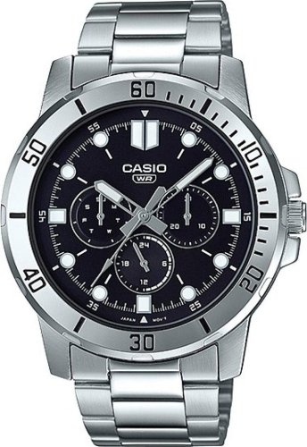 Zegarek męski CASIO MTP-VD300D-1E to doskonałe połączenie nowoczesnego designu i praktycznej funkcjonalności, które przypadnie do gustu każdemu miłośnikowi nowoczesnej elegancji. Jego okrągła, stalowa koperta w srebrnym kolorze nadaje mu wyjątkowego charakteru, a jednocześnie sprawia, że zegarek staje się uniwersalnym dodatkiem pasującym zarówno do codziennych stylizacji, jak i bardziej formalnych okazji. Tarcza zegarka, utrzymana w stonowanej, czarnej kolorystyce, została ozdobiona srebrnymi indeksami oraz smukłymi wskazówkami, które zapewniają doskonałą czytelność czasu. Chronografy umieszczone na tarczy dodają całości nuty dynamizmu i nowoczesności.