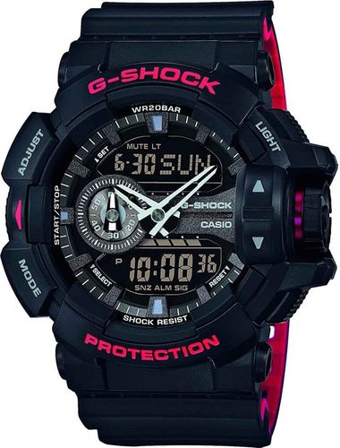 Zegarek męski Casio GA-400HR-1AER G-Shock     Mechanizm Kwarcowy Rodzaj Analogowo - Cyfrowy Dokładność chodu +/- 15 sek Materiał koperty Tworzywo sztuczne Pasek Tworzywo sztuczne Szkiełko Mineralne Wymiary koperty 55.0 x 51.9 x 18.3 (mm) Wodoodporność do 20 ATM Funkcje       Auto LED Light 5 Alarmów Tryb drzemki Automatyczny kalendarz Czas światowy Timer Stoper Czas w 4 strefach Gwarancja 36 miesiące Opakowanie Producenta EAN 4549526136085 Zegarek męski Casio GA-400HR-1AER to kwarcowy mechanizm zamknięty w obudowie z czarnego tworzywa sztucznego o wysokiej wytrzymałości. Czarna obręcz zegarka doskonale kontrastuje z czerwonymi napisami. Na czarnym tle tarczy poszczególne elementy wyróżniono białym kolorem. Jeśli chodzi o bransoletę, to wyróżnia się ona od innych tym, że wierzch jest koloru czarnego, zaś wewnętrzna strona paska, przylegająca do nadgarstka jest barwy czerwonej. Na tarczy znalazły się analogowe wskazówki godzinowe i minutowe, jak również analogowe wyświetlacze. Tarcza podświetlana jest diodą LED, która pozwala na równomierne podświetlenie całej tarczy, okryta zaś szkiełkiem mineralnym. Użyte materiały sprawiają, że zegarek ten jest zarówno lekki jak i wygodny w użytkowaniu.   Jeśli chodzi o funkcje zegarka męskiego GA-400HR-1AER posiada on datownik, stoper, 5 alarmów. Czasomierz wskazuje czas dobowy, w dwóch różnych strefach czasowych, do wyboru spośród wszystkich stref czasowych. Cechą rozpoznawalną tych zegarków jest system G-Shock, który zabezpiecza zegarek przed wstrząsami i uderzeniami. Dodatkowym atutem jest żywotność baterii, która wynosi aż 3 lata. Zegarek cechuje wodoodporność na poziomie 20 atm.   Zegarek męski GA-400HR-1AER to doskonały wybór dla osób, które szukają wytrzymałego, zegarka, który sprawdzi się w najróżniejszych warunkach, zarówno podczas uprawiania sportów, ale również, na co dzień. Jego lekkość, wygoda w noszeniu, mnogość funkcji czynią go zegarkiem uniwersalnym nieznoszącym kompromisów.   Seria G-Shock powstała w 1983r. gdy japoński konstruktor Kikuo Ibe postanowił stworzyć czasomierz, który "przetrwa wszystko". Z czasem powstały zegarki o konstrukcji odpornej już nie tylko na wstrzasy ale takze zabrudzenia z kurzu a nawet błota. Do tego w ofercie Casio znajdziemy modele zegarków G-Shock klasy premium z bardziej rozbudowanymi funkcjami jak: waveceptor, termometr czy wysokościomierz.