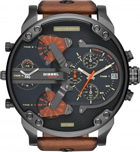 Zegarek męski Diesel Mr. Daddy 2.0 DZ7332 to duży męski zegarek. Brązowy skórzany pasek doskonale komponuje się z czarną kopertą, którą wykonano z hipoalergicznej stali szlachetnej. Na tarczy zamontowano 4 oddzielne mechanizmy mierzenia czasu. Całość pokryta szkłem mineralnym gwarantuje wytrzymałość na zarysowania i pęknięcia. Wodoodporność na 30 metrów chroni przed zachlapaniem. Zastosowany mechanizm kwarcowy jest niezawodny. Model Diesel Mr. Daddy 2.0 DZ7332 to połączenie niewymuszonej elegancji ze sportowym charakterem - musi przyciągać uwagę!