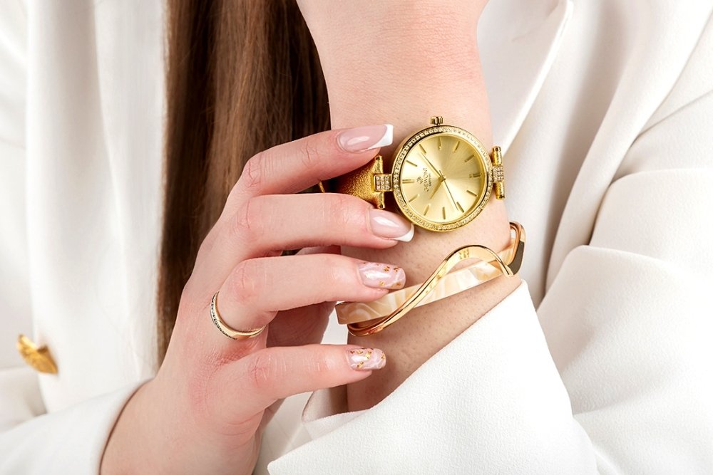 Zegarek wyróżnia się okrągłą kopertą otoczoną delikatnym pierścieniem z cyrkoniami, które nadają mu jubilerski blask. Złoty pasek zapewnia komfort noszenia, a całość charakteryzuje się wysoką jakością wykonania oraz dbałością o detale, co czyni go doskonałym wyborem zarówno na co dzień, jak i na specjalne okazje.