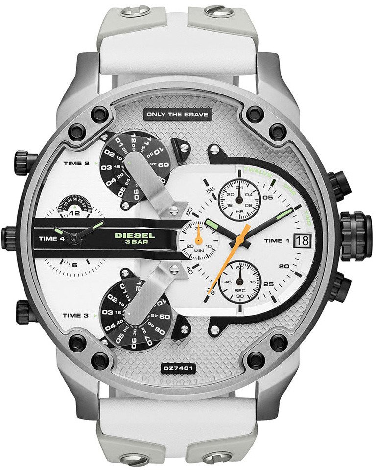 Zegarek męski Diesel Mr. Daddy 2.0 DZ7401 to duży męski zegarek. Biało szary skórzano gumowy pasek doskonale komponuje się ze srebrną kopertą, którą wykonano z hipoalergicznej stali szlachetnej. Na tarczy zamontowano 4 oddzielne mechanizmy mierzenia czasu. Całość pokryta szkłem mineralnym gwarantuje wytrzymałość na zarysowania i pęknięcia. Wodoodporność na 30 metrów chroni przed zachlapaniem. Zastosowany mechanizm kwarcowy jest niezawodny. Model Diesel Mr. Daddy 2.0 DZ7401 to połączenie niewymuszonej elegancji ze sportowym charakterem - musi przyciągać uwagę!