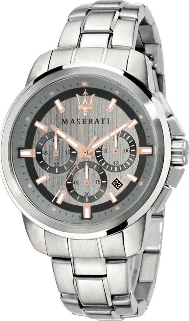 Zegarek Maserati R8873621004 to elegancki i nowoczesny zegarek męski. Na szarej tarczy ze złotymi indeksami zabezpieczonej mineralnym szkłem znajdziemy datownik wskazujący dzień miesiąca oraz subtarcze będące wskazaniami chronografu i czasu dobowego.
