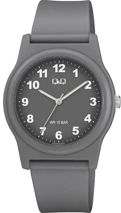 Okrągła koperta oraz pasek wykonane z tworzywa sztucznego w eleganckim szarym kolorze sprawiają, że zegarek Q&Q G22A-020V jest nie tylko praktyczny, ale także stylowy. Szerokość koperty wynosząca 38 mm oraz grubość 10 mm sprawiają, że zegarek doskonale leży na nadgarstku, łącząc wygodę z estetyką.