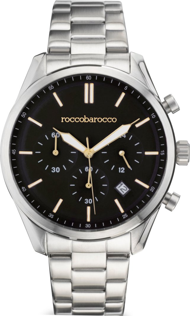 Zegarek męski RoccoBarocco to połączenie wyjątkowego stylu, funkcjonalności i precyzji w jednym urządzeniu. Ten prestiżowy zegarek zachwyca zarówno swoim nowoczesnym designem, jak i wysoką jakością wykonania, czyniąc go idealnym dodatkiem do garderoby każdego mężczyzny. Zegarek RoccoBarocco wyposażony jest w precyzyjny mechanizm kwarcowy, który gwarantuje dokładność wskazań czasu. Zegarek działa płynnie i niezawodnie, dzięki czemu zawsze możesz polegać na jego wskazaniach. Ten zegarek emanuje elegancją i stylowym minimalizmem. Jego okrągła koperta wykonana jest z wytrzymałej stali nierdzewnej, co zapewnia trwałość przez wiele lat. Czarna tarcza z chronografem i datownikiem oraz z delikatnymi złotymi indeksami i wskazówkami nadaje mu niepowtarzalny charakter. Zegarek posiada również wodoszczelność na poziomie WR50 co sprawia, że model ten jest odporny na zachlapania np. podczas mycia auta.