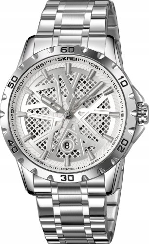 Zegarek Skmei 9337 to wyjątkowa, męska elegancja z odrobiną oryginalności – przyciąga uwagę wpadającą w oko, lecz jednocześnie delikatną kolorystyką. Srebrna koperta i bransoleta tworzą solidną, klasyczną bazę, która pięknie kontrastuje z trójwymiarową tarczą w odcieniach srebra. Ta tarcza z elementami 3D dodaje głębi i charakteru, a srebrne, fluorescencyjne indeksy i wskazówki sprawiają, że zegarek jest doskonale czytelny o każdej porze.