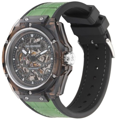 Koperta zegarka została wykonana z poliwęglanu, co zapewnia lekkość oraz wytrzymałość. Pasek, stworzony z połączenia skóry i silikonu, gwarantuje komfort noszenia oraz długotrwałą trwałość. Dzięki zastosowanym materiałom, zegarek jest nie tylko estetyczny, ale także funkcjonalny.
