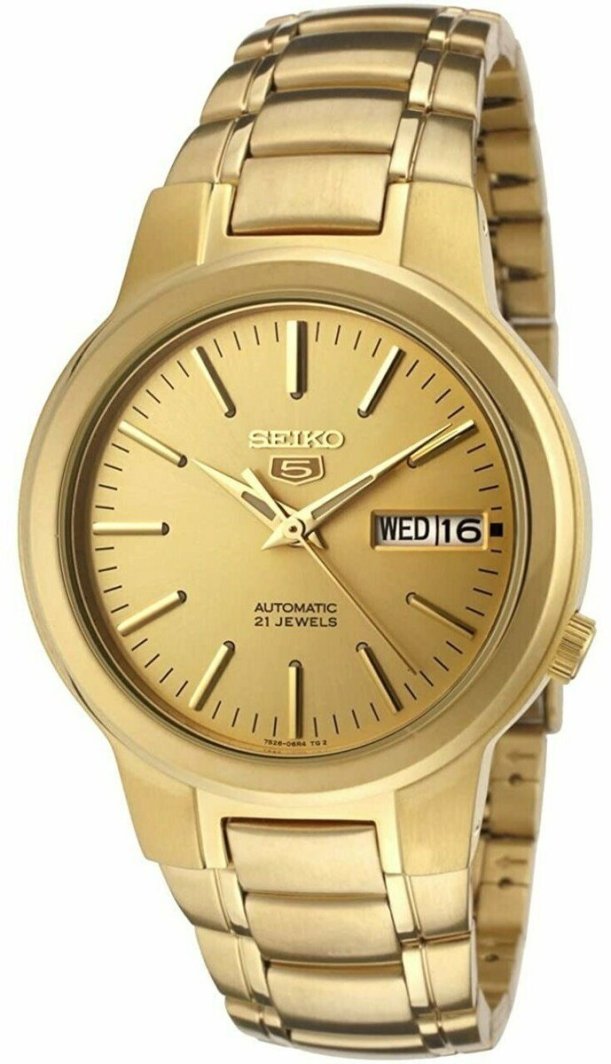 Zegarek męski Seiko 5 Automatic SNKA10K1 to elegancki czasomierz, który łączy klasyczny design z nowoczesną funkcjonalnością. Jego okrągła koperta o średnicy 37,5 mm, wykonana ze stali nierdzewnej pokrytej złotym PVD, nadaje mu wyjątkowego charakteru. Złota tarcza zegarka jest minimalistyczna, co sprawia, że doskonale sprawdzi się na każdą okazję.