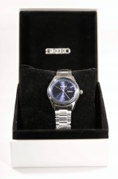 Niebieska tarcza zegarka Seiko SNE525P1 wyróżnia się eleganckim wyglądem, a dodatkowe funkcje, takie jak datownik dni miesiąca oraz dni tygodnia, czynią go praktycznym dodatkiem. Klasyczny design sprawia, że zegarek przyciąga wzrok i podkreśla indywidualny styl noszącego.