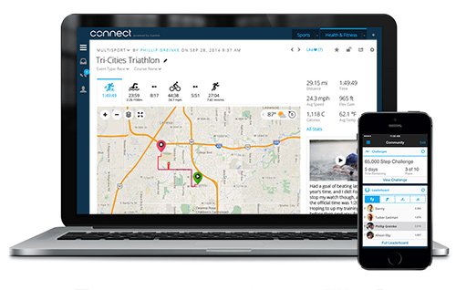 Treningi zakładkowe i wyścigi zyskają zupełnie nowe oblicze dzięki bezpłatnej społeczności online Garmin Connect, w której można zapisywać, planować i udostępniać swoje ćwiczenia. Po zakończeniu aktywności z wykorzystaniem profilu aktywności Multisport w urządzeniu czas etapu i przejścia jest zapisywany w jednym pliku w celu zapewnienia łatwiejszego wyświetlania i udostępniania. Poszczególne zakładki zapewniają dostęp do szczegółowych danych odnoszących się do każdego z etapów.
