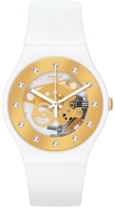 Stylowy design zegarka Swatch SUOZ148 łączy w sobie biel i złoto, co czyni go idealnym dodatkiem do każdej garderoby. Złoty cyferblat z kryształowym akcentem nadaje mu wyjątkowego charakteru, sprawiając, że jest to nie tylko zegarek, ale również modny dodatek.