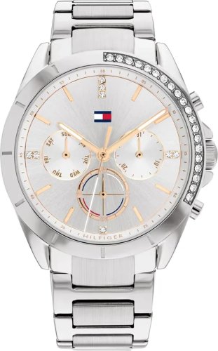 Tommy Hilfiger Kennedy 1782384 to niezwykły zegarek damski od kultowej marki, który odzwierciedla najnowsze trendy. Ten elegancki damski zegarek działa dzięki niezawodnemu mechanizmowi kwarcowemu. Koperta i bransoleta wykonane są ze stali szlachetnej, co zapewnia im dużą trwałość. Cała konstrukcja jest utrzymana w kolorze srebrnym, a charakterystycznym elementem jest srebrna tarcza ozdobiona szlifem słonecznym, co nadaje mu nowoczesny, przemysłowy wygląd. Ponadto zegarek ten nie tylko piękny, ale również funkcjonalny, posiada trzy małe tarcze przedstawiające dni tygodnia, dni miesiąca oraz czas w skali 24-godzinnej. Wodoszczelność na poziomie 5 ATN sprawia, że jest on ochronny nawet podczas kąpieli.