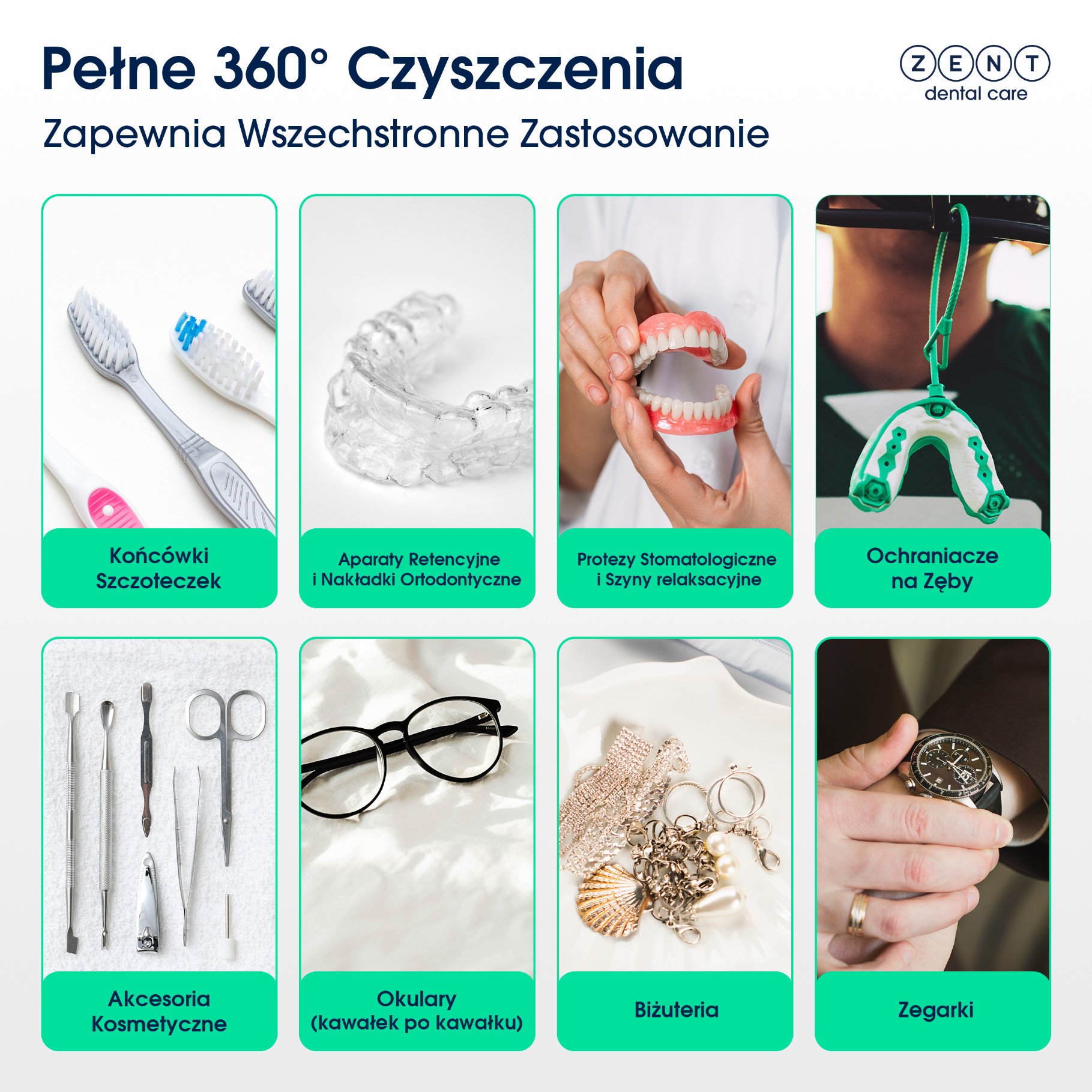 Idealnie nadaje się do czyszczenia protez stomatologicznych, nakładek ortodontycznych, szyn relaksacyjnych, ochraniaczy na zęby oraz końcówek szczoteczek elektrycznych.