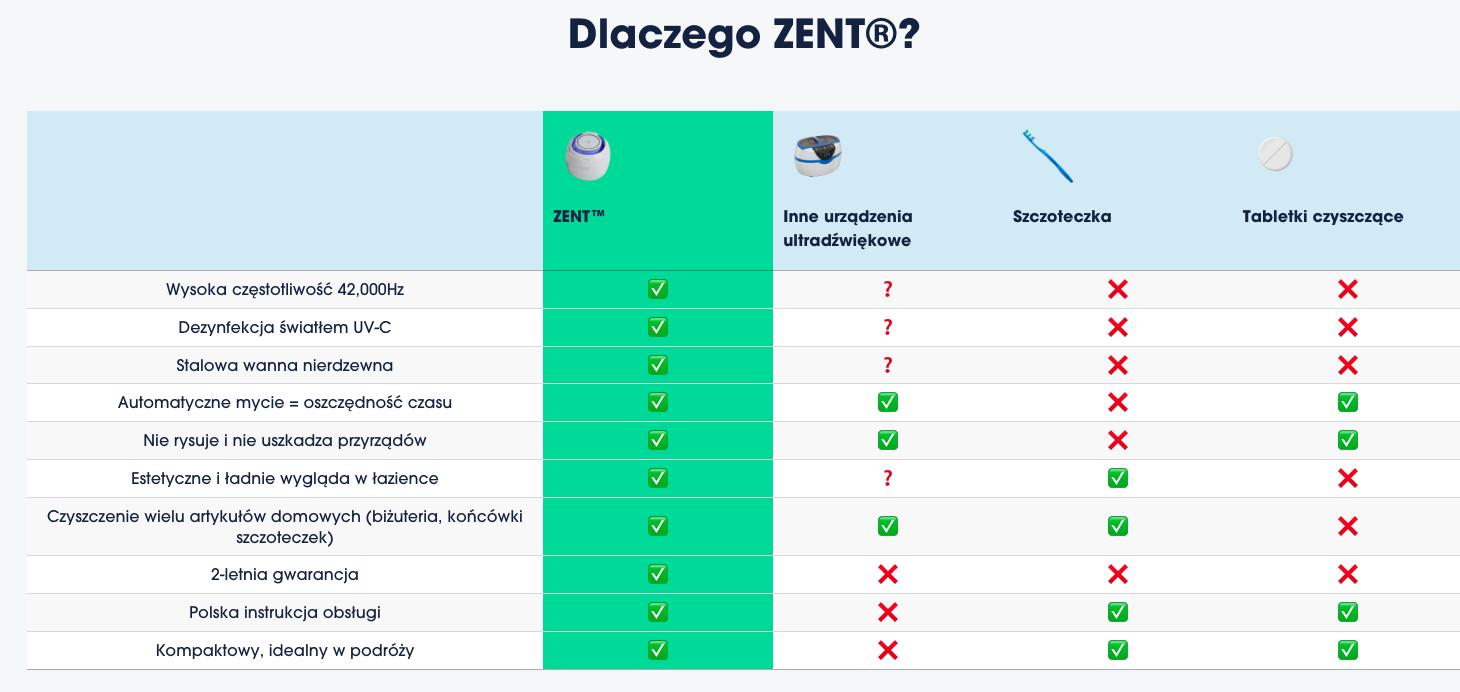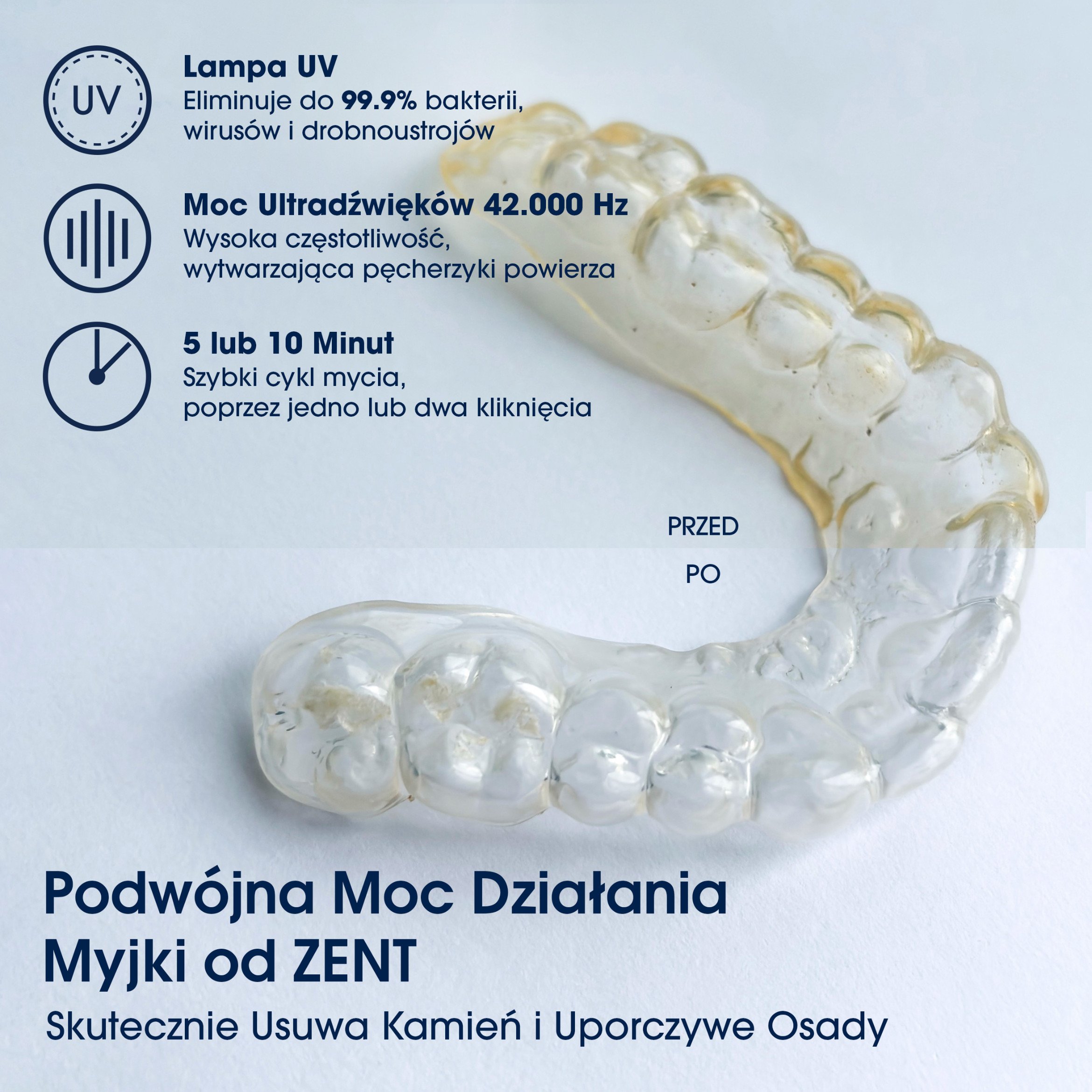Zent™ Ultrasonic Cleaner to zaawansowana myjka ultradźwiękowa wyposażona w lampę UV, która skutecznie eliminuje zarazki, wirusy, bakterie i inne drobnoustroje.