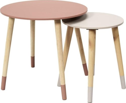 Zestaw dwóch kolorowych stolików Trundle odmieni przestrzeń i doda wiosennego, przyjemnego wyglądu naszemu salonowi lub pokojowi dziecka. Zestaw składa się z 2 stolików. Duży stolik o wymiarach: wysokość 48cm i średnicy 43cm oraz mały stolik o wymiarach wysokość: 40cm i średnicy 33cm. Blaty stolików wykonane zostały z lakierowanej płyty MDF. Nogi stolika to lite sosnowe drewno. Stoliki wymagają montażu. Max. obciążenie na jeden stolik 10kg.