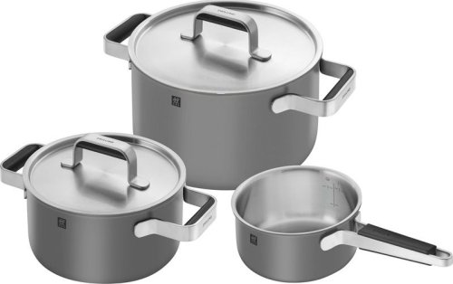 Zamieniaj noc w dzień i ciesz się wspólnymi chwilami. To właśnie symbolizuje zestaw naczyń ZWILLING Pure w kolorze szarym. Pierwsze trójwarstwowe naczynia kuchenne ze stali nierdzewnej z zewnętrzną powłoką ceramiczną oferują styl i wydajność, których potrzebujesz, aby stworzyć coś wyjątkowego. Wysokiej jakości stal nierdzewna jest trwała i zapewnia doskonałe magazynowanie ciepła. Trójwarstwowa technologia dna gwarantuje szybkie i równomierne rozprowadzanie ciepła, a wyprofilowany rant umożliwia nalewanie bez kapania. Dzięki temu możesz gotować i serwować kulinarne arcydzieła raz za razem.ZWILLING Pure to połączenie elegancji i funkcjonalności, które uczyni gotowanie jeszcze przyjemniejszym. Zamień każdą chwilę w kuchni w niezapomniane doświadczenie dzięki zestawowi, który jest nie tylko trwały i higieniczny, ale również wyjątkowo stylowy. Gotuj z pasją i ciesz się wspólnymi chwilami przy stole!CECHY SZCZEGÓLNEPierwsze trójwarstwowe naczynia ze stali nierdzewnej z zewnętrzną powłoką ceramicznąOdporna na ścieranie powłoka zewnętrzna w kolorze szarymTechnologia trójwarstwowego dna zapewnia idealne rozprowadzanie i magazynowanie ciepłaUchwyty Stay-Cool z silikonowymi wstawkami, które pozostają chłodne podczas gotowaniaMożliwość mycia w zmywarce i używania w piekarniku do 180°CZAWARTOŚĆ ZESTAWUGarnek wysoki z pokrywką - 24 cmGarnek niski z pokrywką - 20 cmRondel - 16 cm